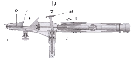 Techniquement, l’air comprimé est bloqué par une soupape (C) , et le débit de peinture est régulé par