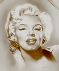 Le travail en transparence est particulièrement adapté au monochrome (une seule couleur utilisée) comme par exemple les portraits présentés dans la galerie. Dans ces cas là je compose une teinte très transparente et c’est les passages successifs de peinture qui me permettront de foncer la teinte aux endroits les plus sombres. De plus, le monochrome valorise le coté photoréaliste des portraits, vous pouvez le constater sur les photos suivantes.